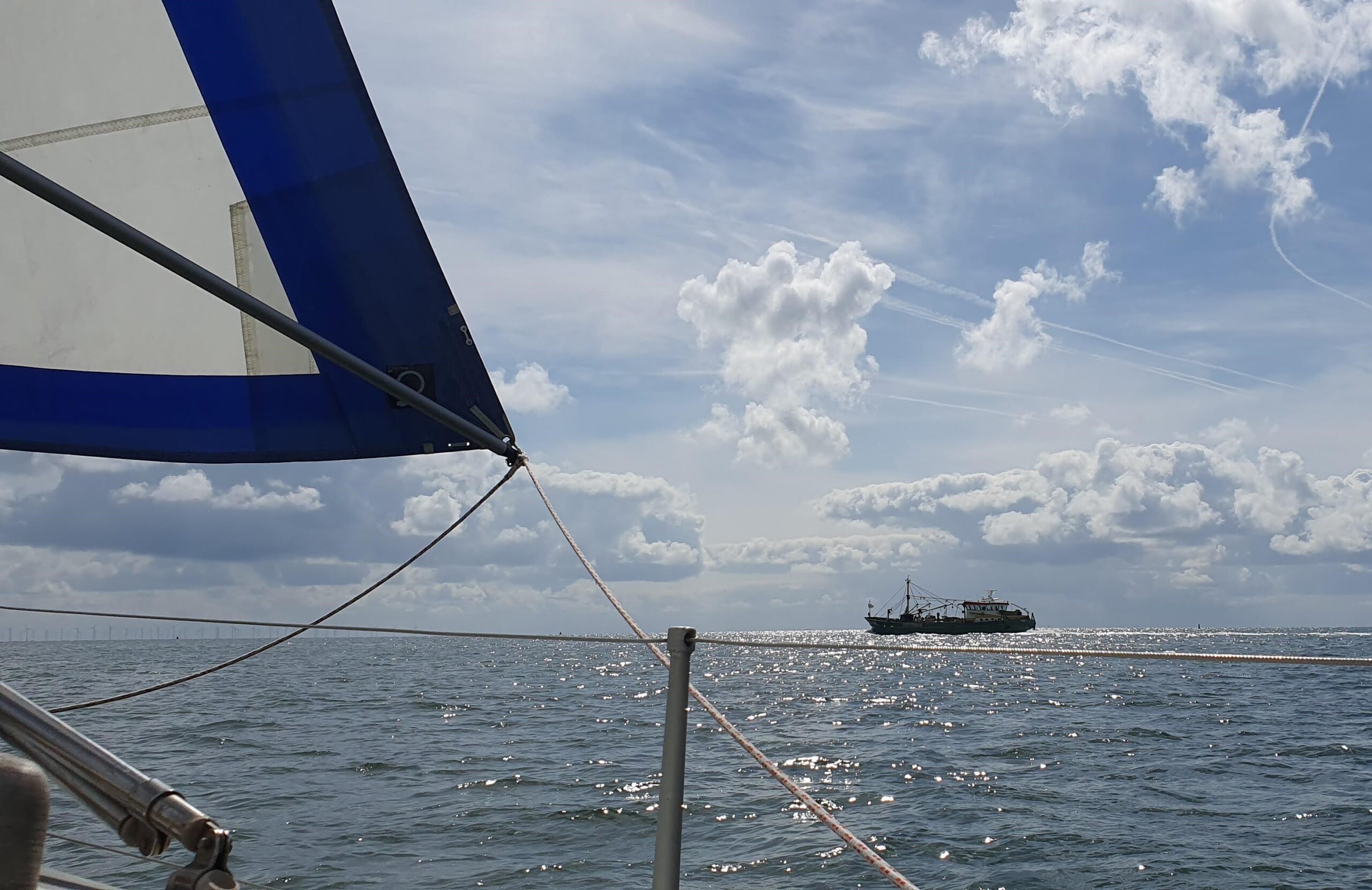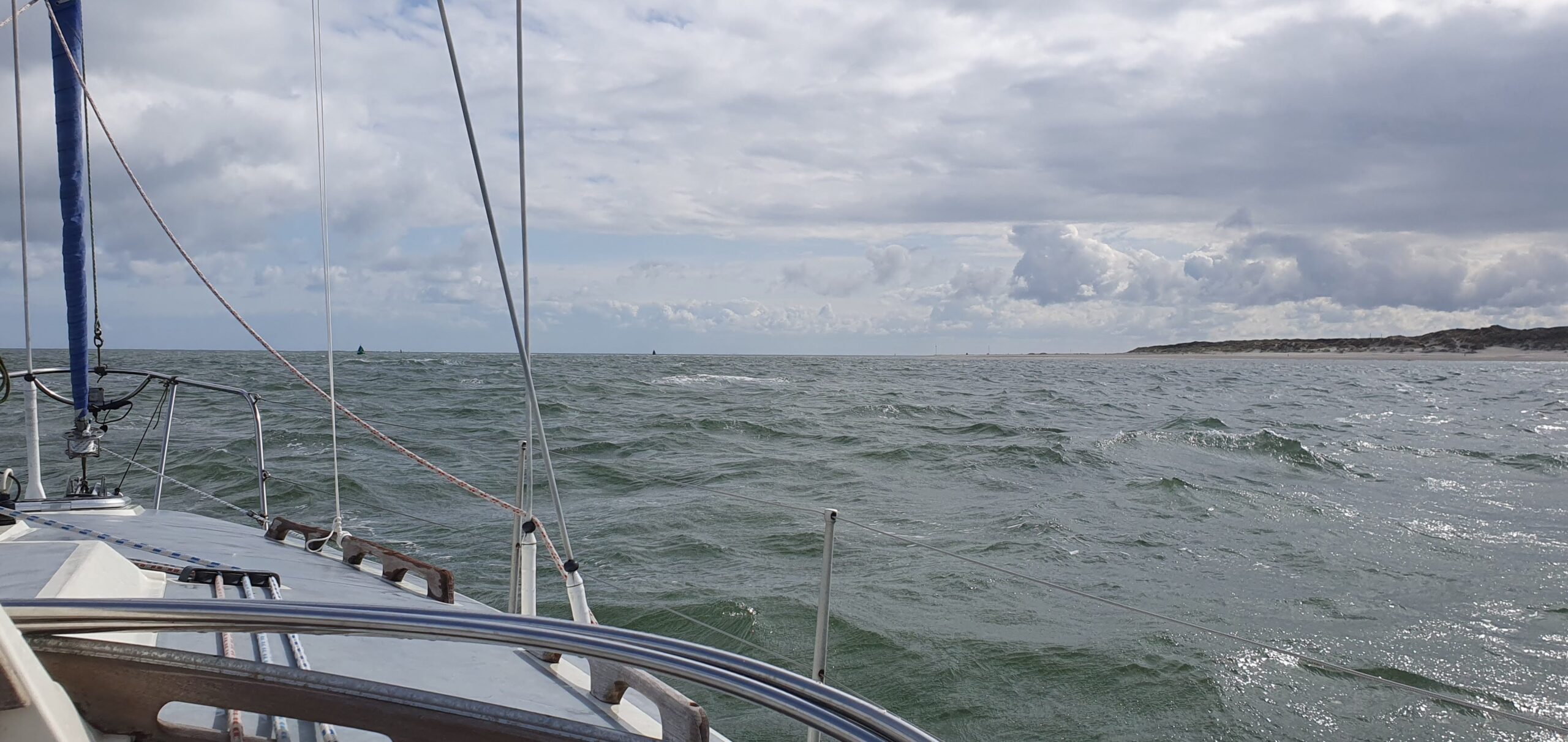 After leaving Texel harbour on time at 10:40 a.m., we turn north to sail along the Texel Current. The rising tide helps us, and the moderate north-westerly wind allows us to sail with a full sail.
