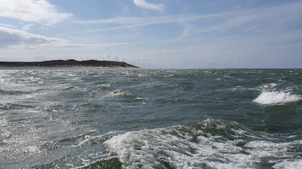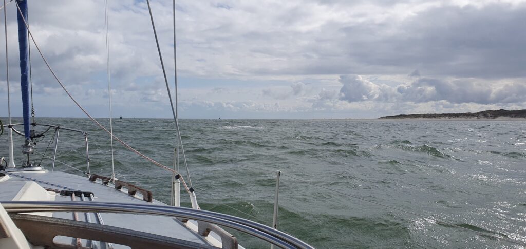 Nach der seichtesten Stelle im Fahrwasser „Omdraai“ kentert der Strom und wir nutzen nun den ablaufenden Ebbstrom, um uns der nächsten „kritischen“ Stelle zu nähern, dem „Seegatt“, das heißt der Öffnung zwischen den Inseln Vlieland und Terschelling. Der auffrischende Nordwind steht gegen den auslaufenden Ebbstrom, was oft zu einer sehr unangenehmen steilen Welle führt, bei über 5 Windstärken kann das sogar gefährlich werden.