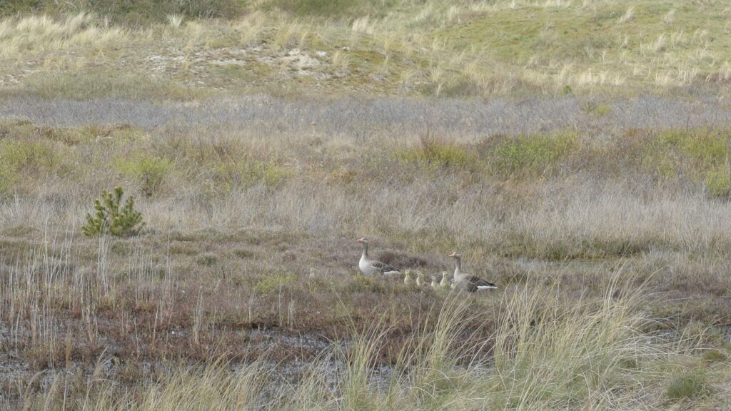 After a few kilometres, we turn back towards the ridge of the sand dunes, where we observe pheasants and wild geese. After a short rest and a late lunch in the moss of the dunes, we enter the pine forest again, where we even discover mushrooms. Strange vegetation can be found on these Wadden islands.