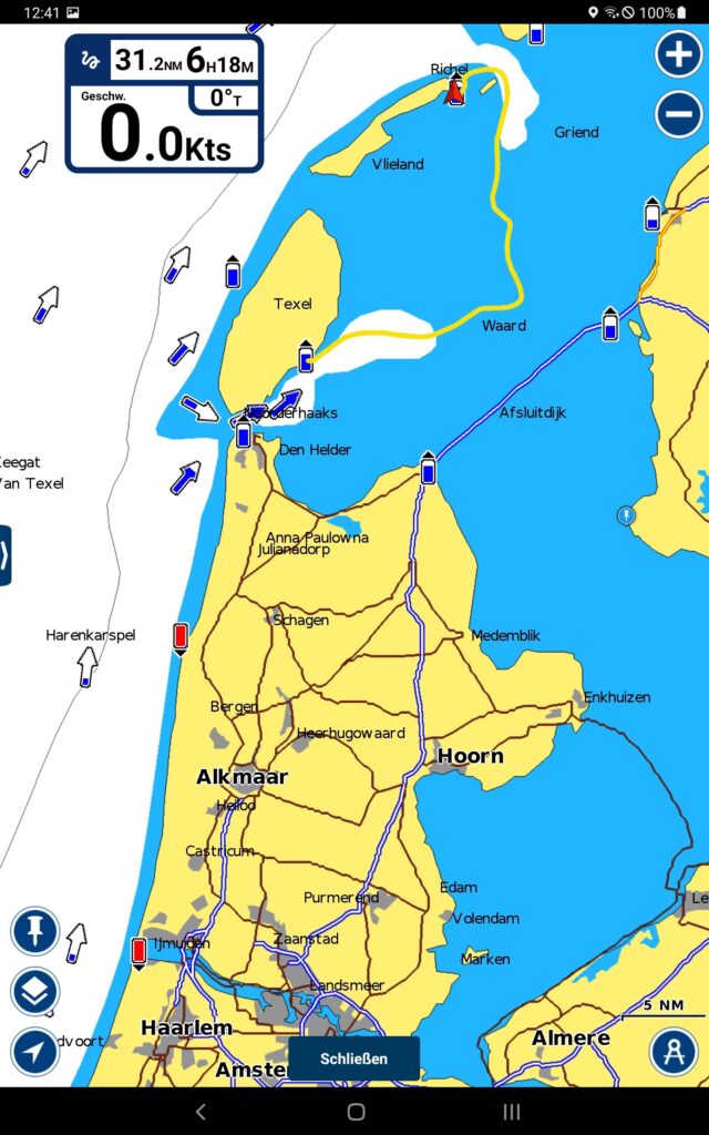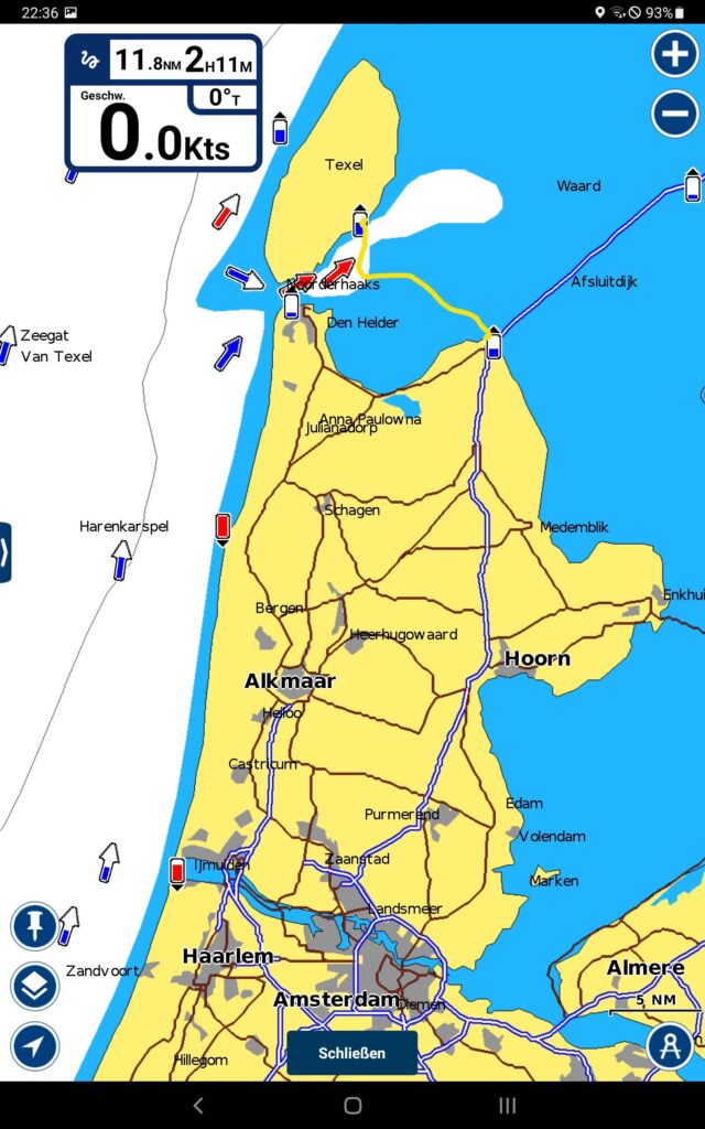 Nachdem wir pünktlich um 10:40 bei der Hafenausfahrt von Texel auf das Waddenmeer hinausgefahren waren, wenden wir uns nach Norden, um den Texelstrom entlangzufahren. Die auflaufende Flut hilft uns dabei, der mäßige Nordwestwind erlaubt Segeln mit Vollzeug.