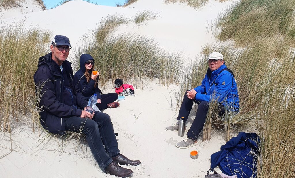 Am ersten Tag auf Terschelling nehmen wir den Bus der Linie 1 (von 2) bis an die Endstation, die treffend „Oosterend“ heißt. Von dort wandern wir über die Dünen an den Nordseestrand, der sich gerade wegen Niedrigwasser besonders breit und mächtig präsentiert. Der Anblick der sich brechenden Dünung bestärkt uns in der Entscheidung, uns diesmal (noch) nicht auf die offene Nordsee zu wagen.