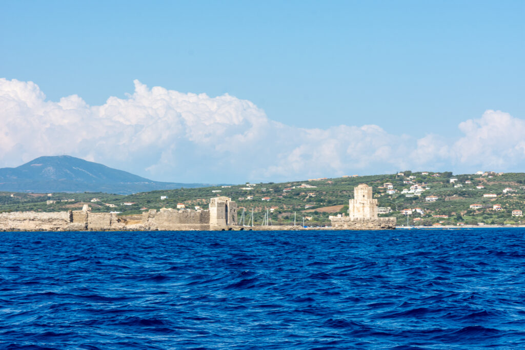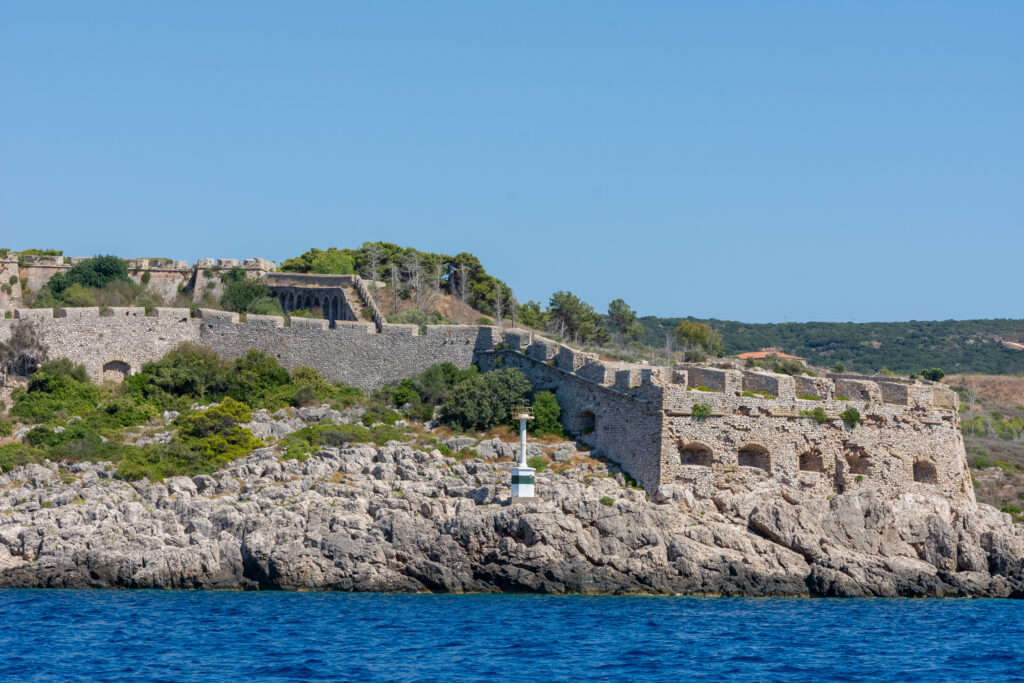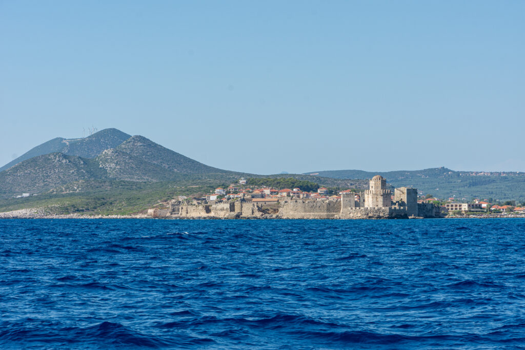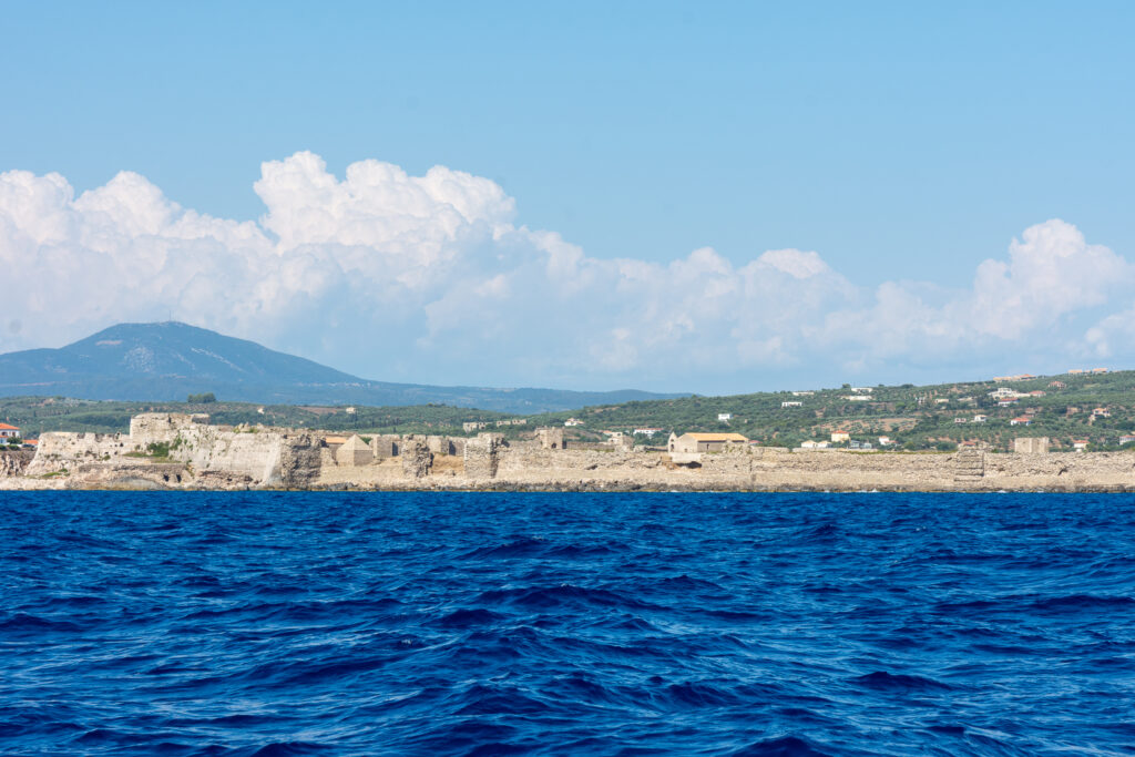 Auf beiden Segelstrecken wurden uns Winde in erträglicher Stärke aber aus achterlichen Richtungen vorhergesagt. Bei der Abreise von Pylos haben wir noch verschiedene Versuche unternommen, diese Brise auch zum richtigen Segeln zu nutzen. Das heißt, wir haben immer mal wieder die Segel gesetzt, haben auch den Gennaker ausgepackt – und wieder eingepackt. Am Ende sind sich doch ein paar Stunden ohne Motorgebrumm ausgegangen.